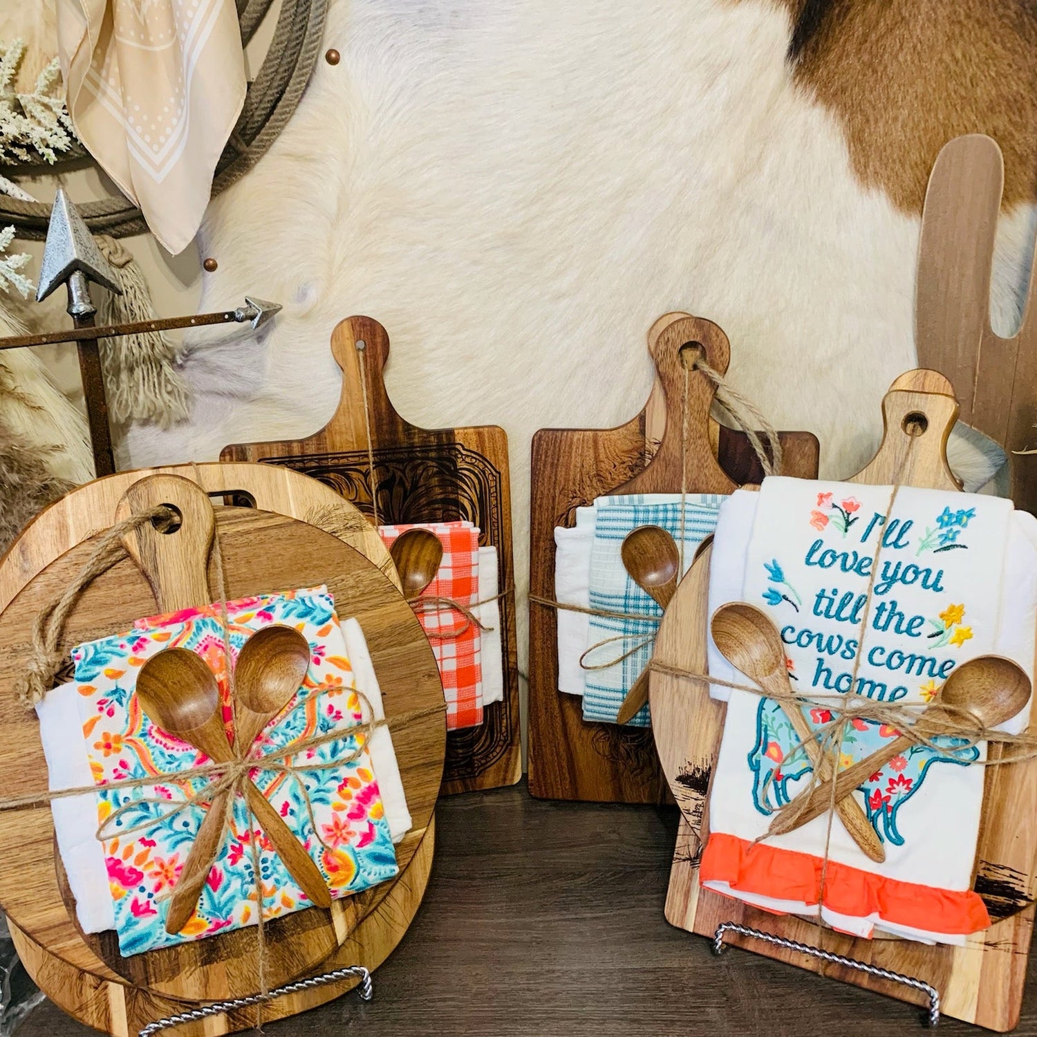 "Beautiful Floral Acacia Charcuterie Board. This gorgeous charcuterie board has quality materials. It shows that it was made with love. It is displayed, as the art piece that it is, above my kitchen cabinets until needed." --- Karin - Sage, AR.