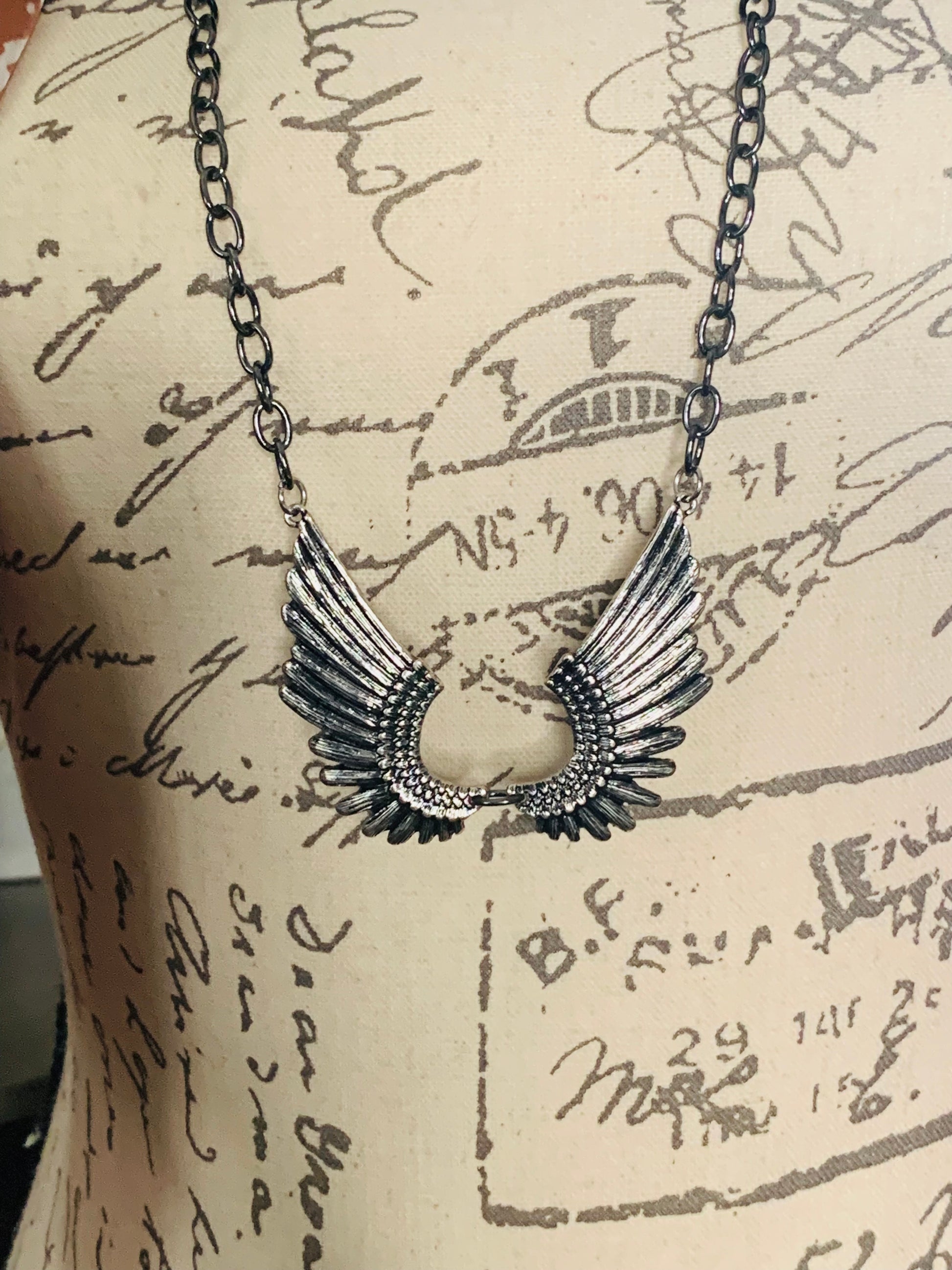 "Embrace your inner cowgirl and let your spirit soar with our "Angels Flying High" Necklace. This unique piece features antiqued silver angel wings on a shiny gun metal link chain, making it the perfect accessory for any spiritual fashionista. Make a statement with this one-of-a-kind necklace that captures the essence of freedom and faith."
