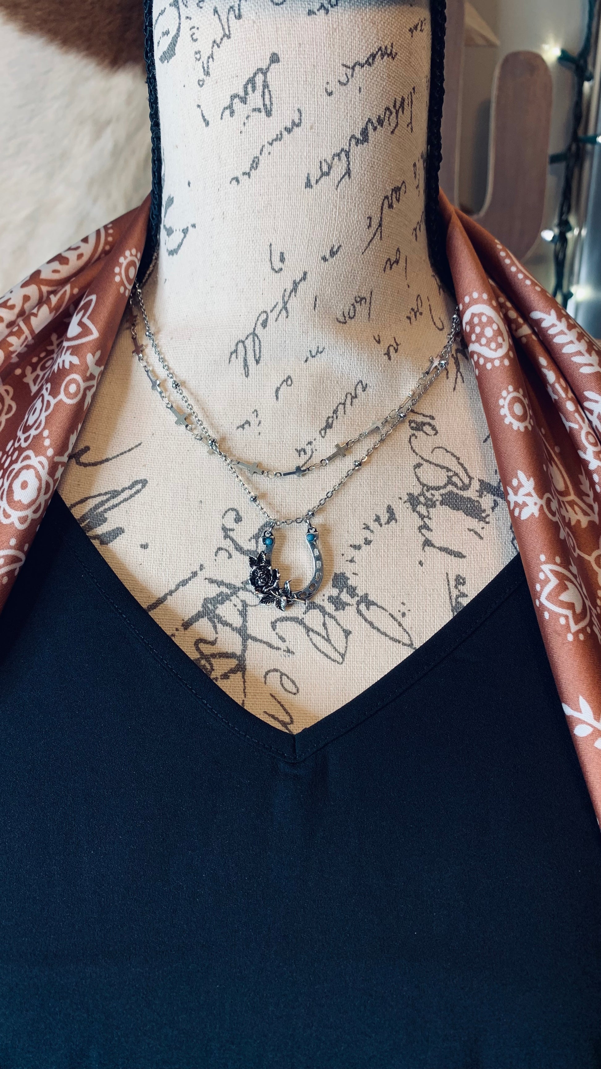 Elevate your style with this Antique Silver Horseshoe and Cross Necklace set. Featuring a vintage-inspired horseshoe pendant on a delicate 16" antique silver beaded chain, it exudes timeless charm. The separate silver cross necklace, also on a 16" chain with a 3" extension, offers versatile layering options—wear them together for a meaningful statement or separately for subtle elegance. Perfect for those who appreciate classic design with a personal touch.