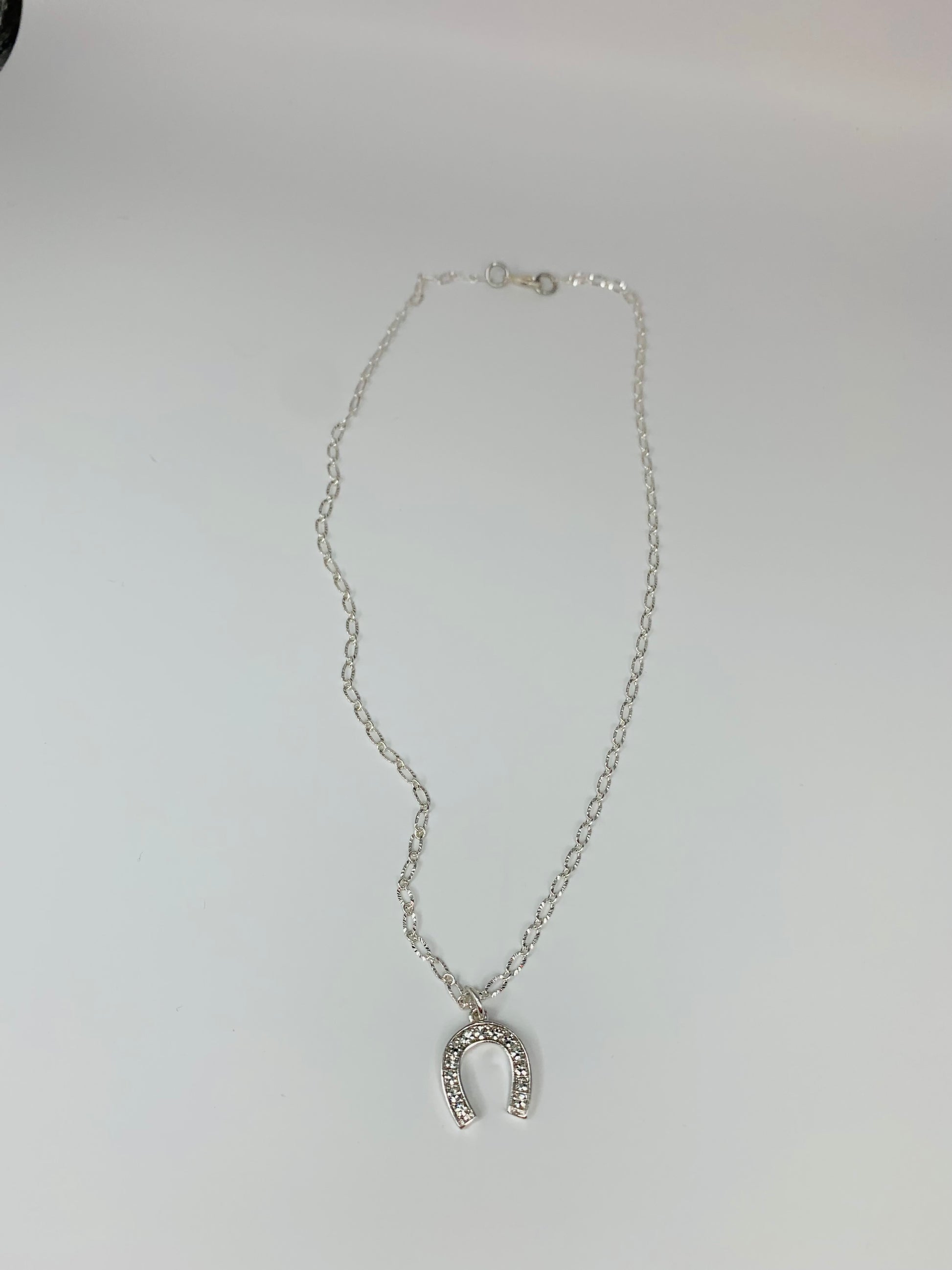 This Bright Silver Horseshoe Necklace features a sparkling rhinestone horseshoe charm suspended from a delicate 16.5-inch bright silver chain that catches the light with every movement. Its elegant design makes it a perfect accessory to add a subtle shine and a symbol of good luck to any outfit, whether for daily wear or special occasions. Elevate your jewelry collection with this charming and graceful piece.