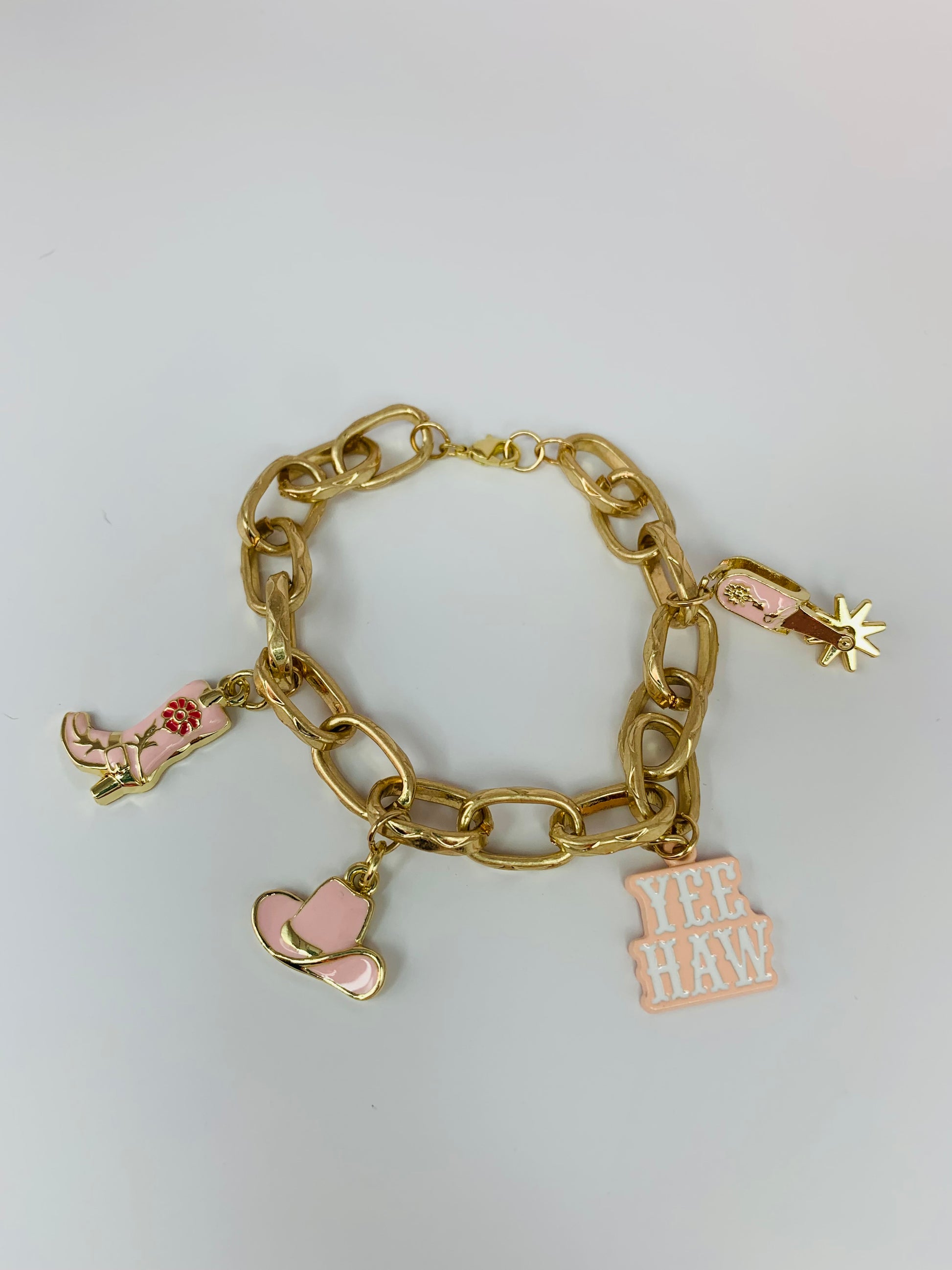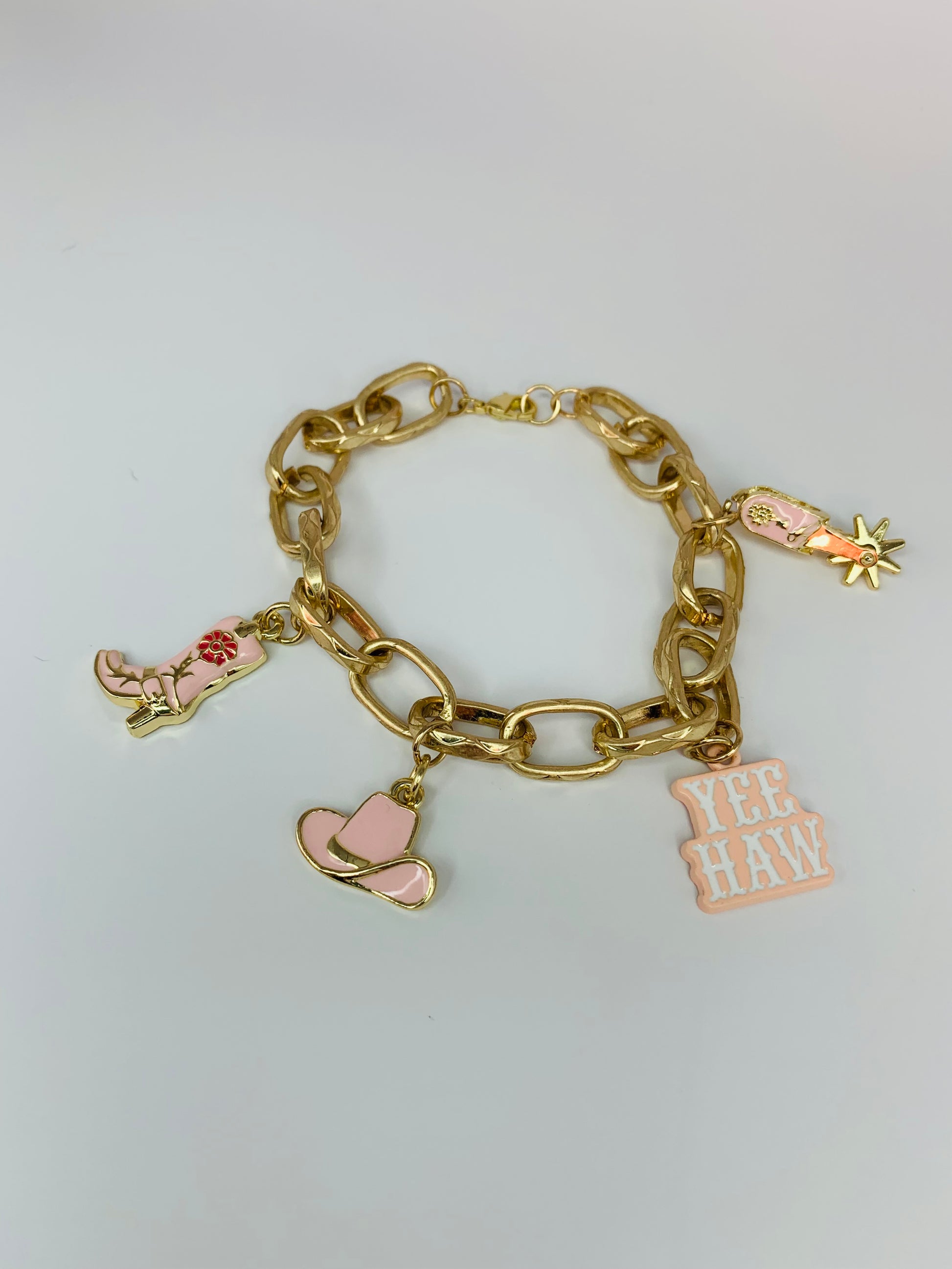Celebrate your wild west spirit with this Cowgirl Charm Bracelet. Crafted on a soft gold-tone link chain, it features four delicate metallic light pink enamel charms: a cowgirl hat, boot, "YEEHAW" text, and a spinning boot spur. This charming accessory adds playful movement and western flair to any outfit, making it a perfect gift for those who love a touch of cowgirl attitude with a feminine twist.