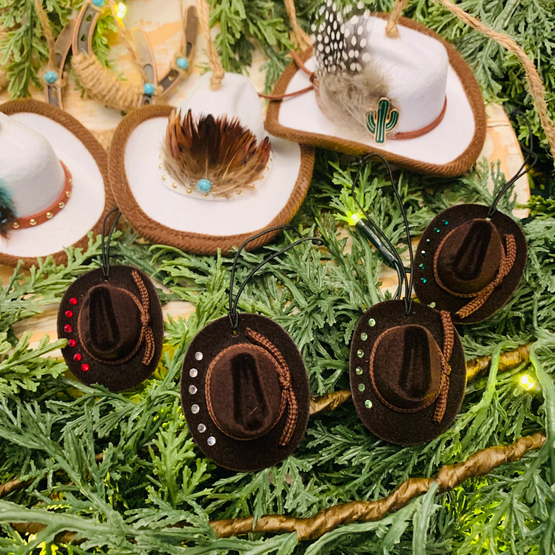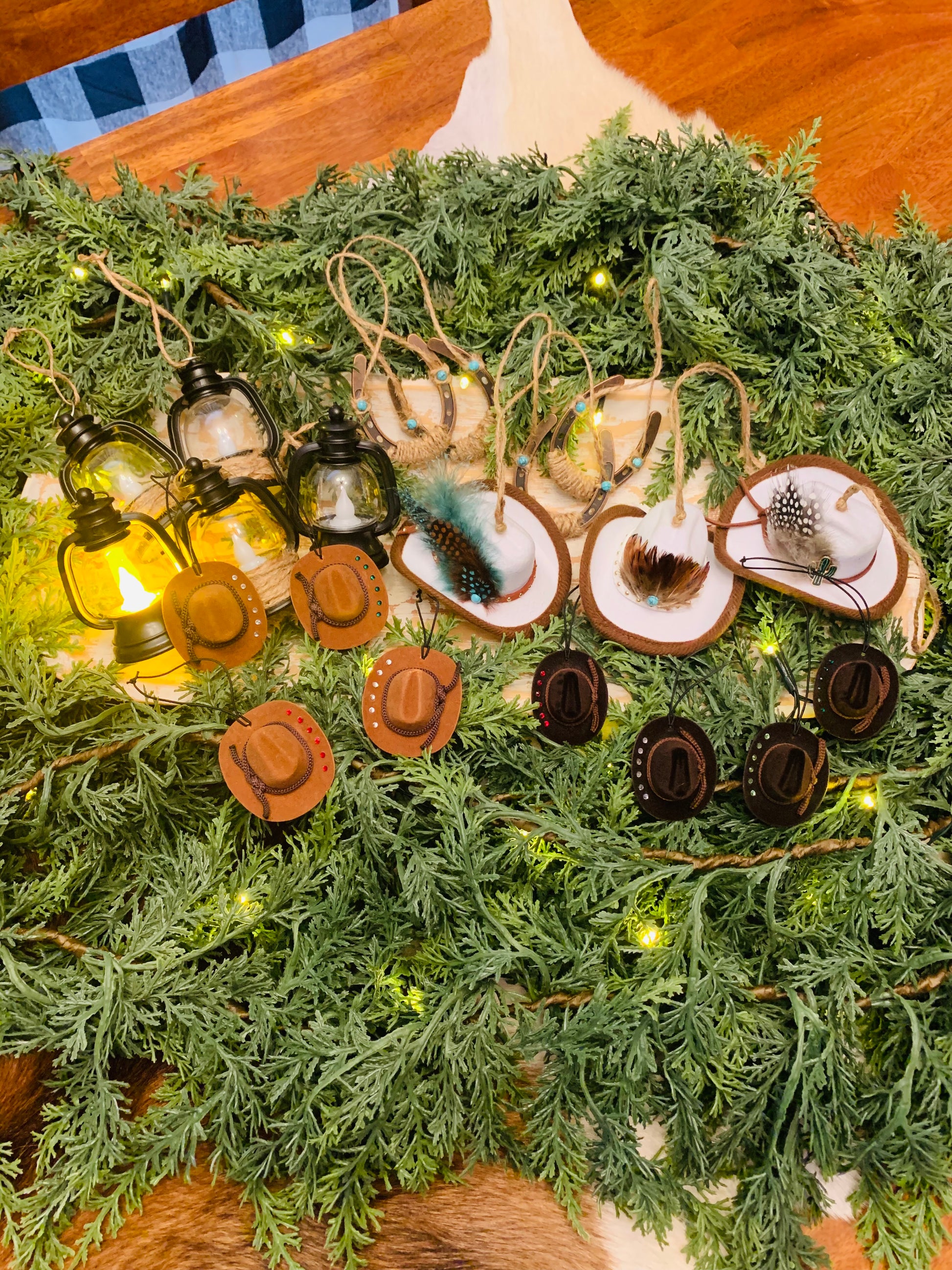 Bring Western charm to your holiday tree with this stunning 20-piece cowboy Christmas ornament collection. This curated set features caramel and dark brown cowboy hats adorned with festive rhinestones, elegant white hats with colorful feathers, rustic horseshoes trimmed in rope and turquoise accents, and interactive light-up black lanterns you can toggle on and off. Perfect for ranch lovers and Western enthusiasts, this mix of textures and styles creates a unique, eye-catching display that celebrates both holiday spirit and frontier tradition. Transform your tree into a one-of-a-kind Western wonderland.