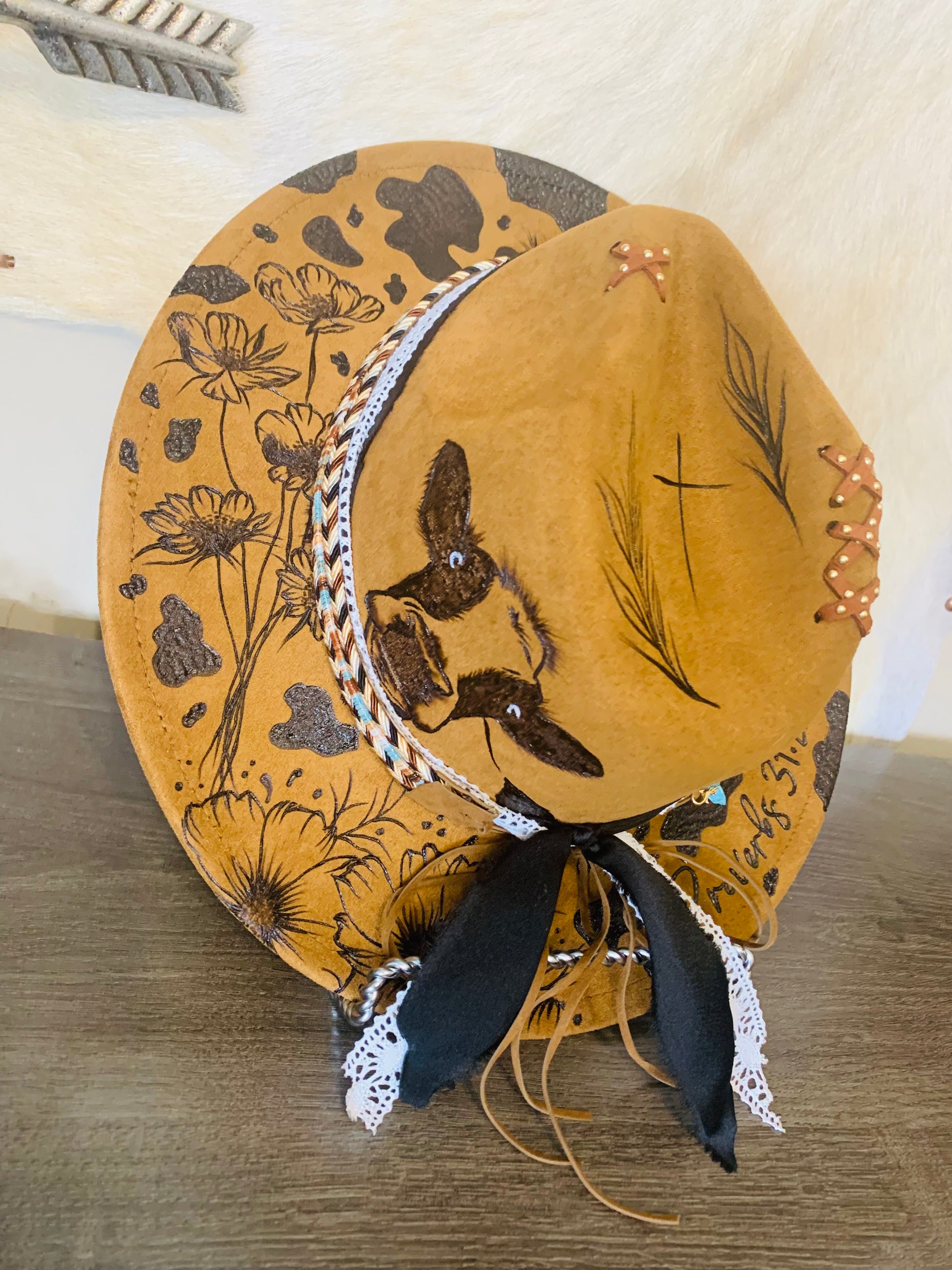 Hand Burned Youth Rancher Hat with Dairy Cow/Cosmos Flower Design