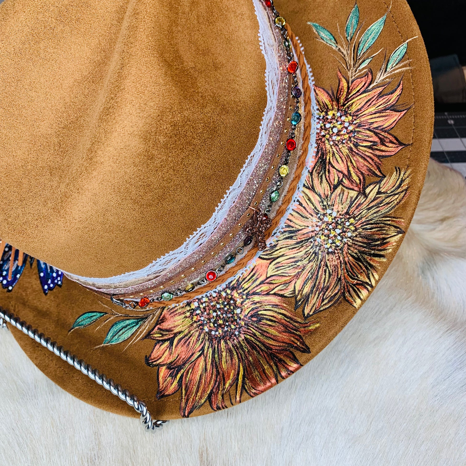 Hand Burned Youth Rancher Hat with Sunflowers/Butterflies Design