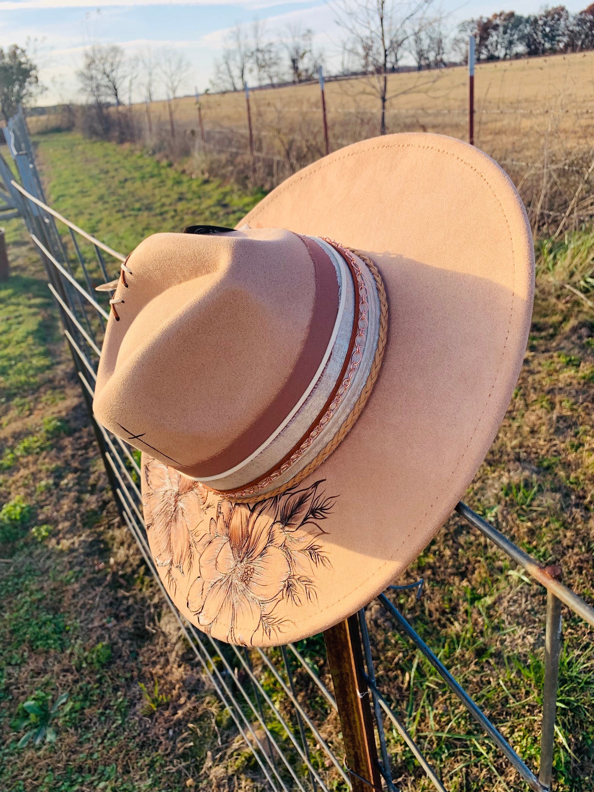 Hand Burned Rancher Hat with Florals "Simplicity"