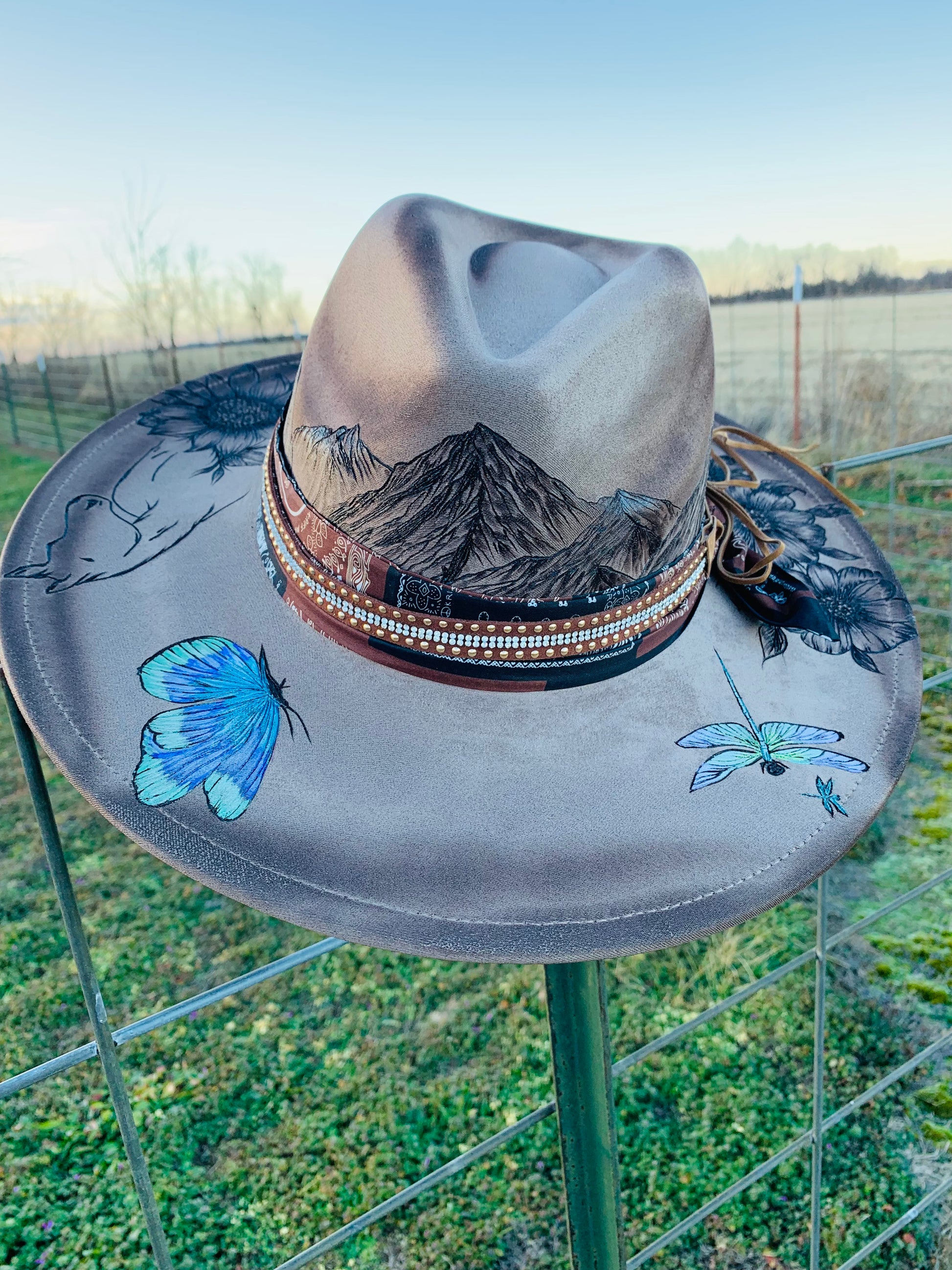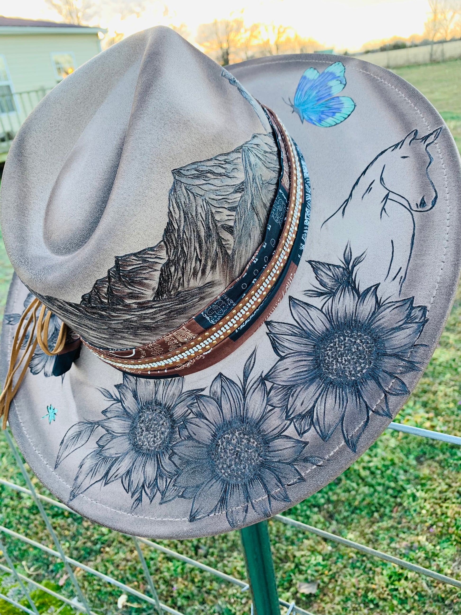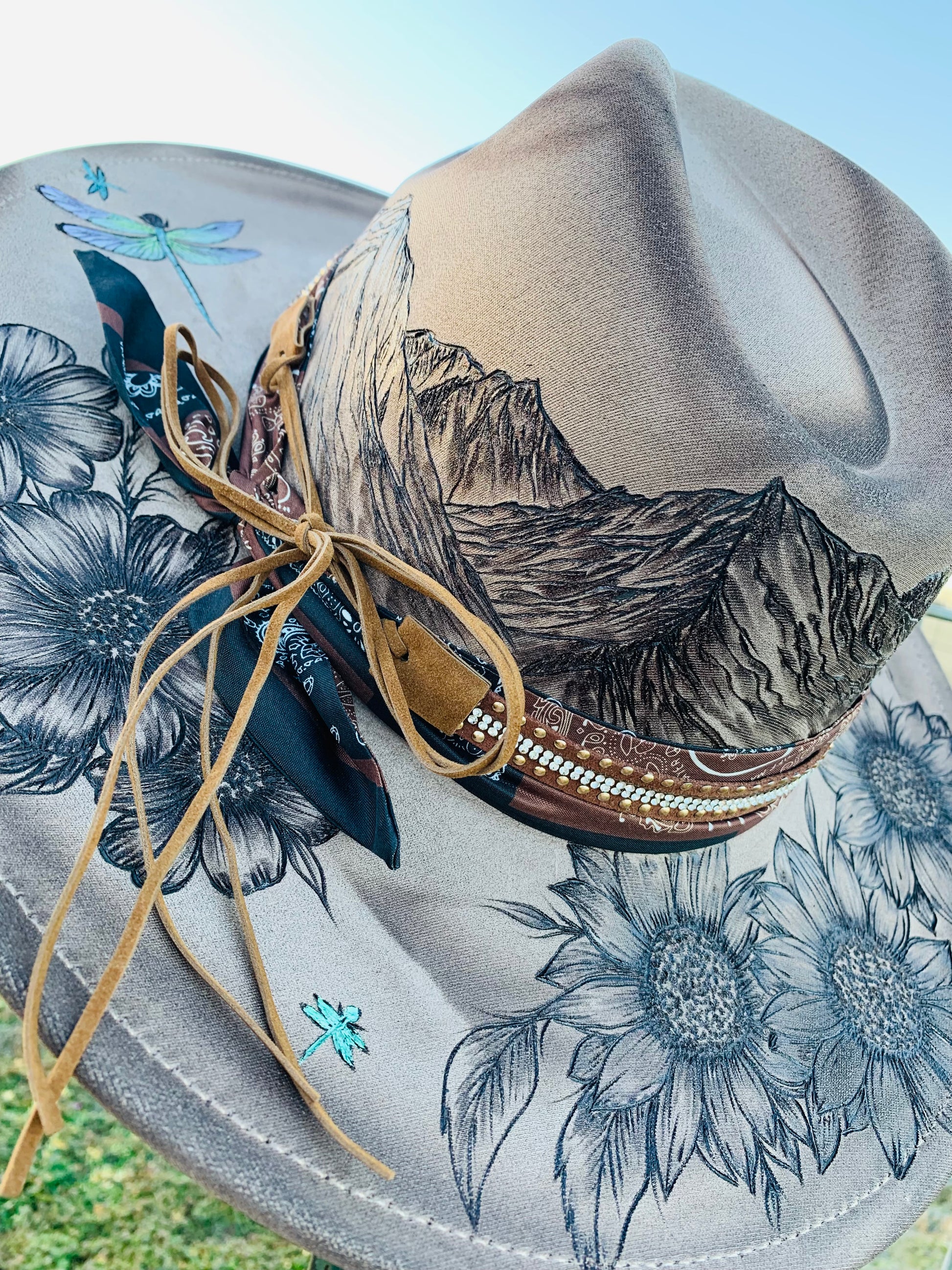 Hand Burned Rancher Hat "Dreaming of the Mountains" Design