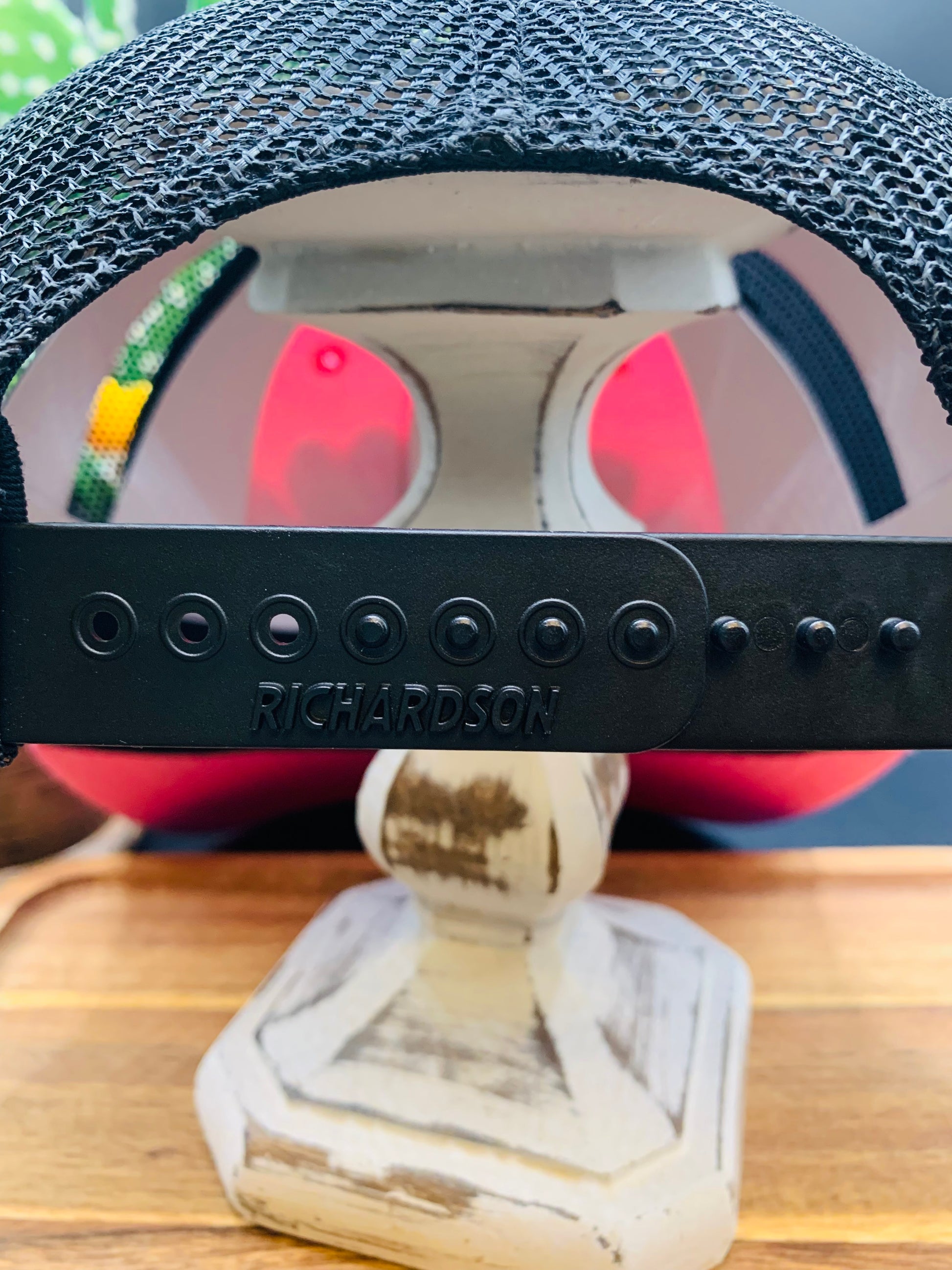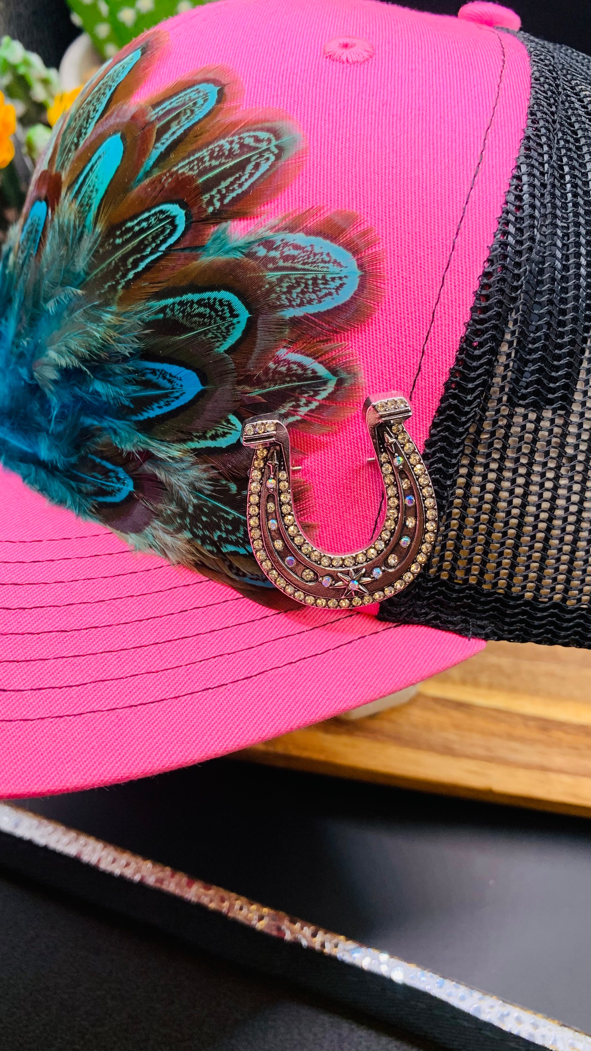 This Richardson Feather Trucker Hat in Two Tone Hot Pink/Black is the perfect addition to any cowgirl outfit. Made with turquoise, copper brown feathers, and embellished with a small turquoise stone and a silver horseshoe hat pin. This trendy hat is sure to turn heads! The adjustable snap strap ensures it fits most sizes. Perfect for country concerts and Nashville nights!