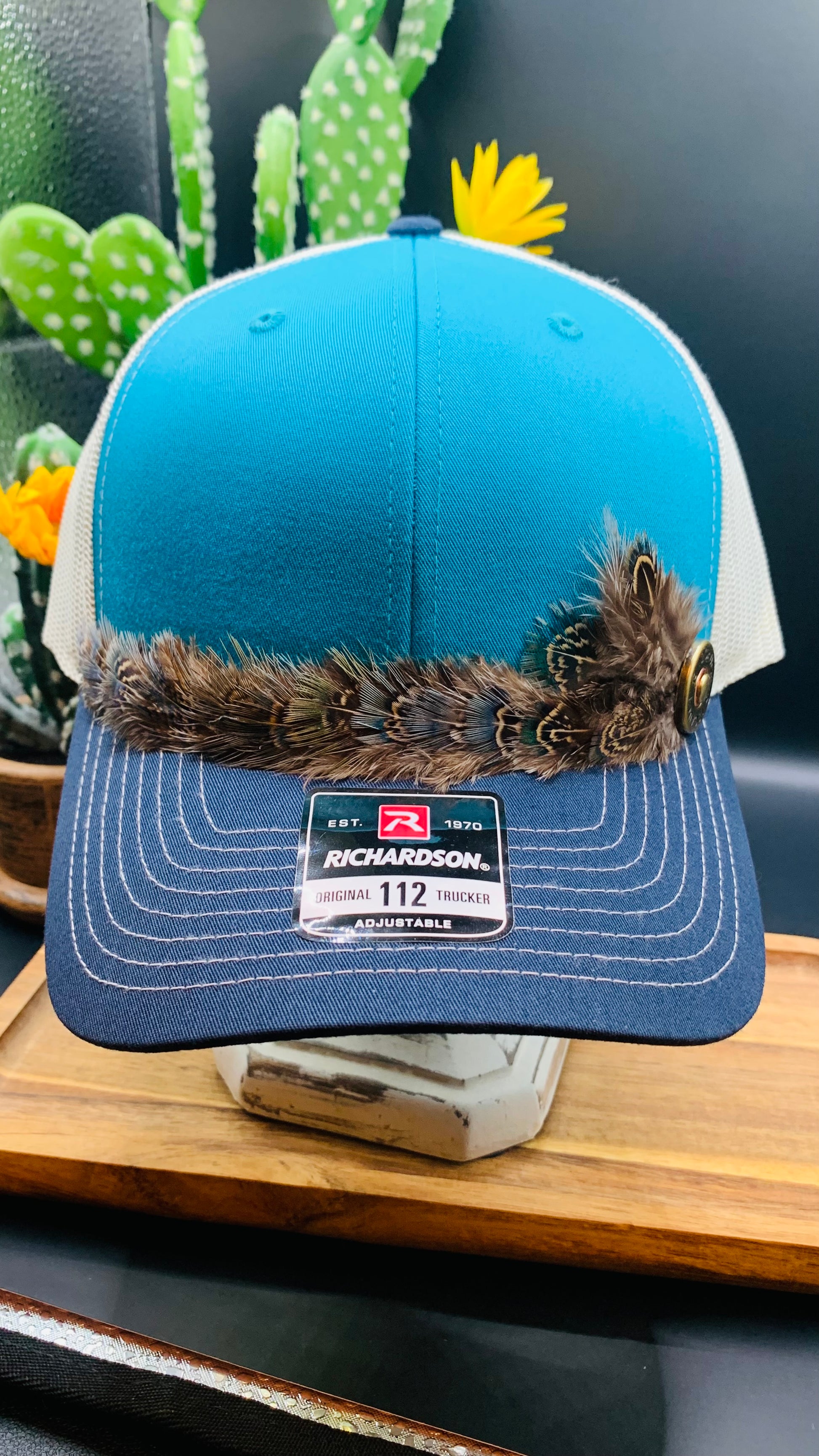 This Richardson Feather Trucker Hat in Three Tone Blue Teal/Birch/Navy is the perfect addition to any cowgirl outfit. Made with light brown copper and blue green tip feathers and embellished with a 12 Gauge Bullet Concho. This trendy hat is sure to turn heads! The adjustable snap strap ensures it fits most sizes. Perfect for country concerts and Nashville nights!