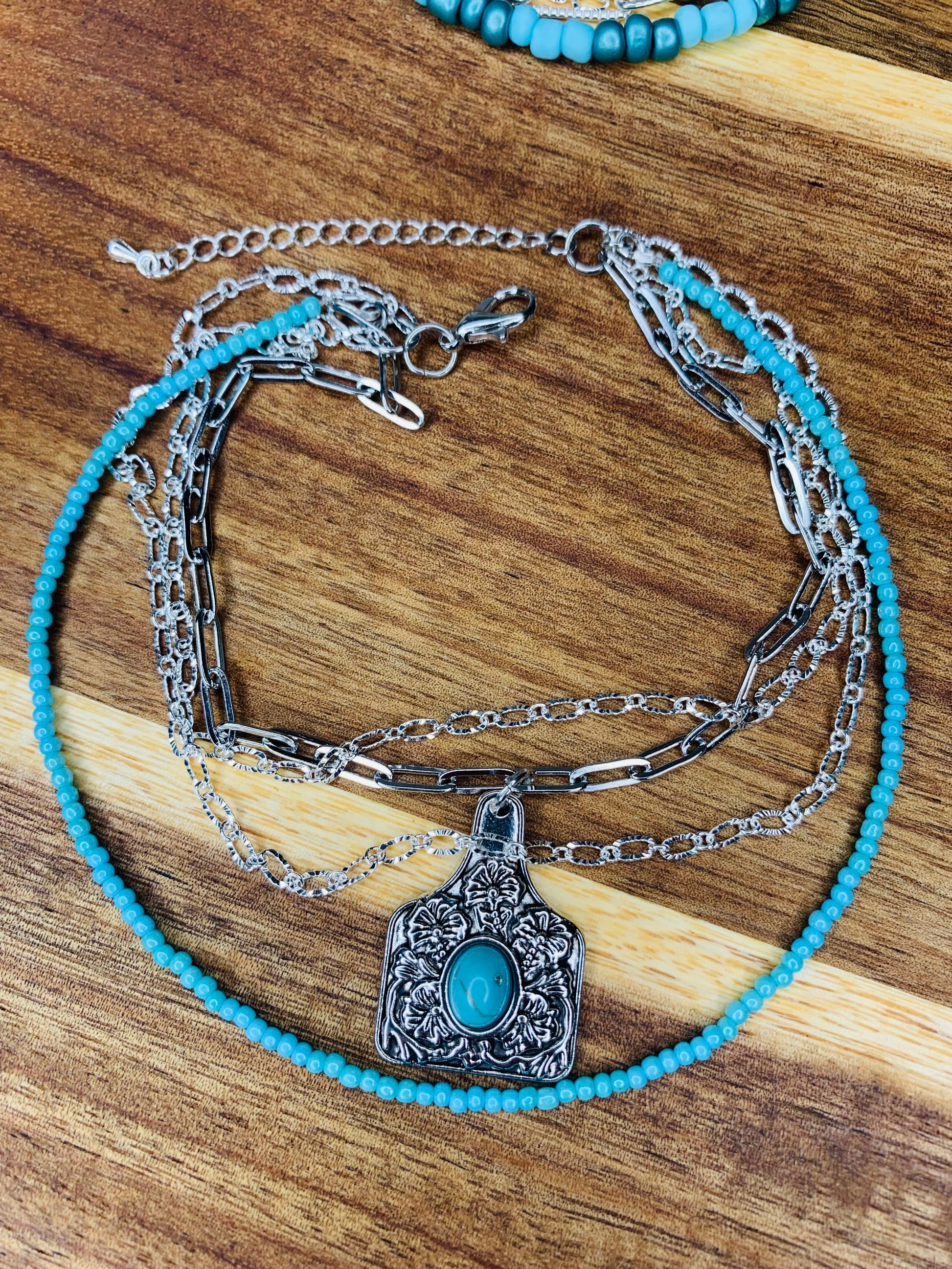 This Turquoise Cow Tag Anklet combines rustic charm with delicate craftsmanship. Featuring three silver chains alongside an antique silver cow tag, it is accented by a handcrafted turquoise seed bead string that adds a pop of color and a touch of the Southwest. Perfect for those seeking a unique accessory that blends vintage style with bohemian flair, this anklet is both eye-catching and versatile, making it an ideal addition to your everyday look or festival outfit.